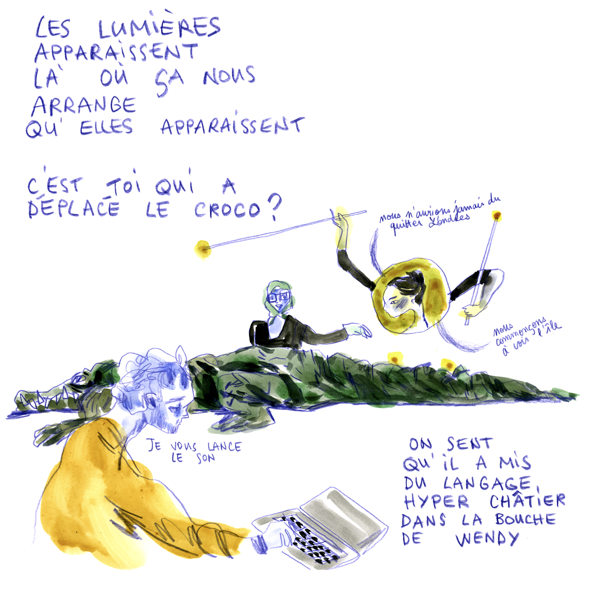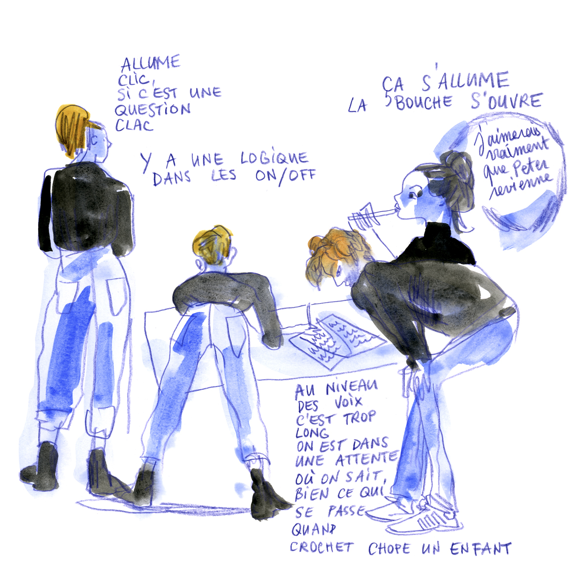 « Comme metteuse en scène, l’écriture de plateau c’est une liberté. Je n’ai jamais réussi à trouver une pièce écrite qui me satisfasse d’un bout à l’autre, alors plutôt que de couper, ou d’adapter, je choisis l’écriture de plateau. »
