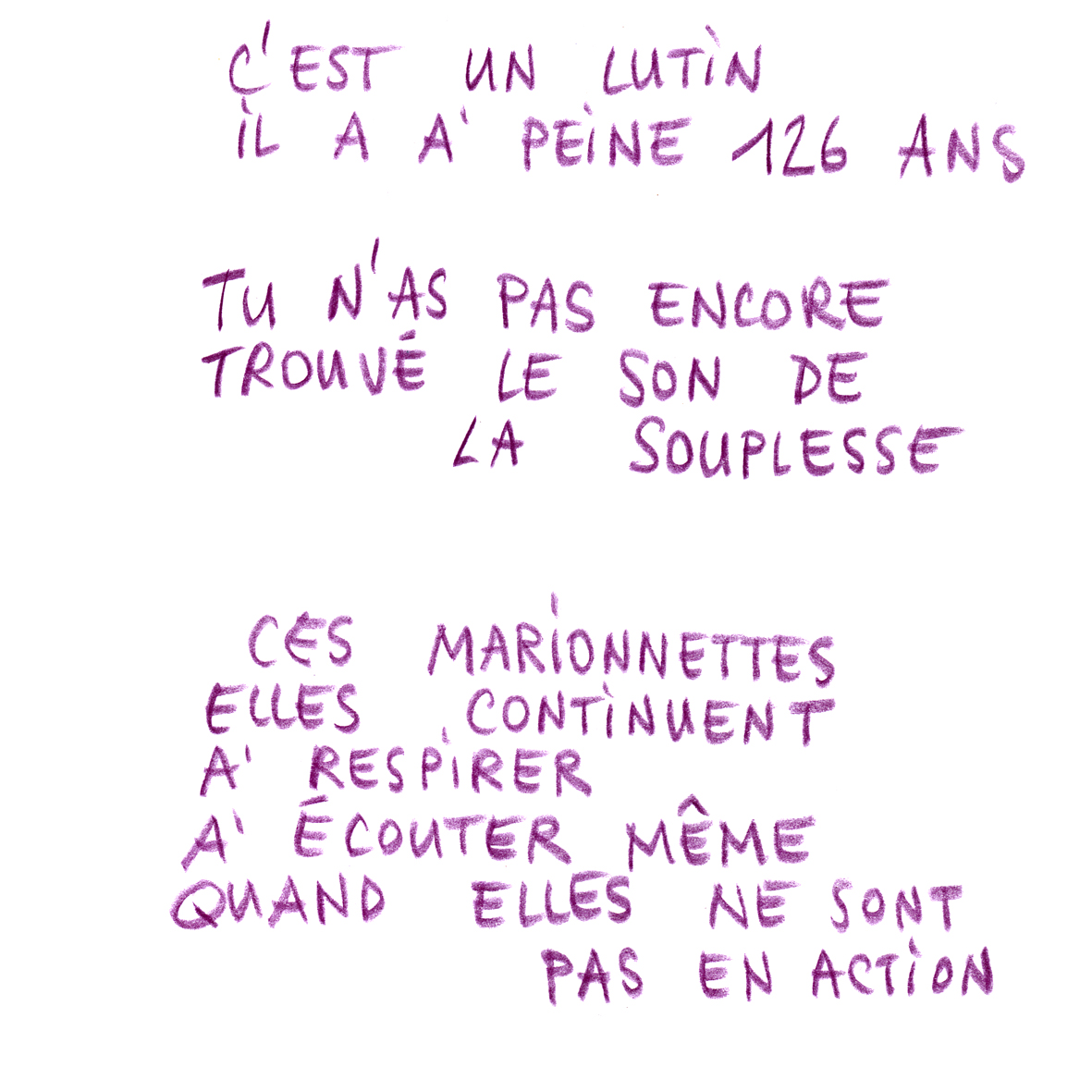 Dans une salle voisine, Sarah Frund, Yan Juillerat et Guillaume Pidancet travaillent sur un texte librement inspiré de «  La fée et le géomètre », de Andrevon, texte et mise en scène Guillaume Pidancet. Ça parle de quoi ? La magie a presque disparu, le Pays vert est devenu une décharge, et même les f leurs sont maintenant des légendes…Mais il reste des jeunes fées et lutins prêtes et prêts à se battre pour transformer leur monde. Printemps Lutin