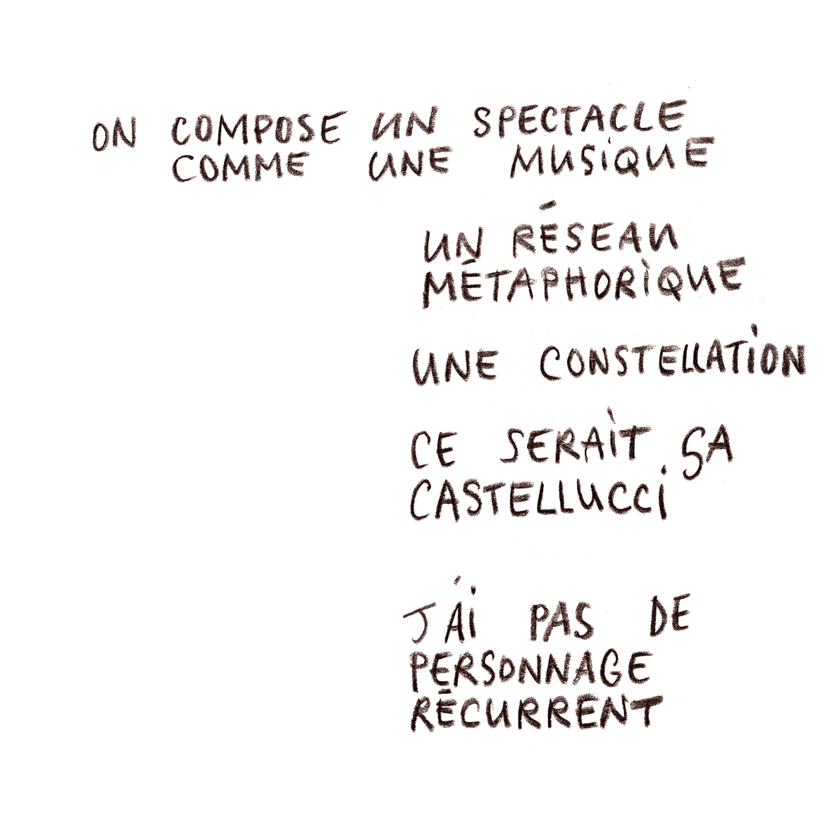 « Comme metteuse en scène, l’écriture de plateau c’est une liberté. Je n’ai jamais réussi à trouver une pièce écrite qui me satisfasse d’un bout à l’autre, alors plutôt que de couper, ou d’adapter, je choisis l’écriture de plateau. »