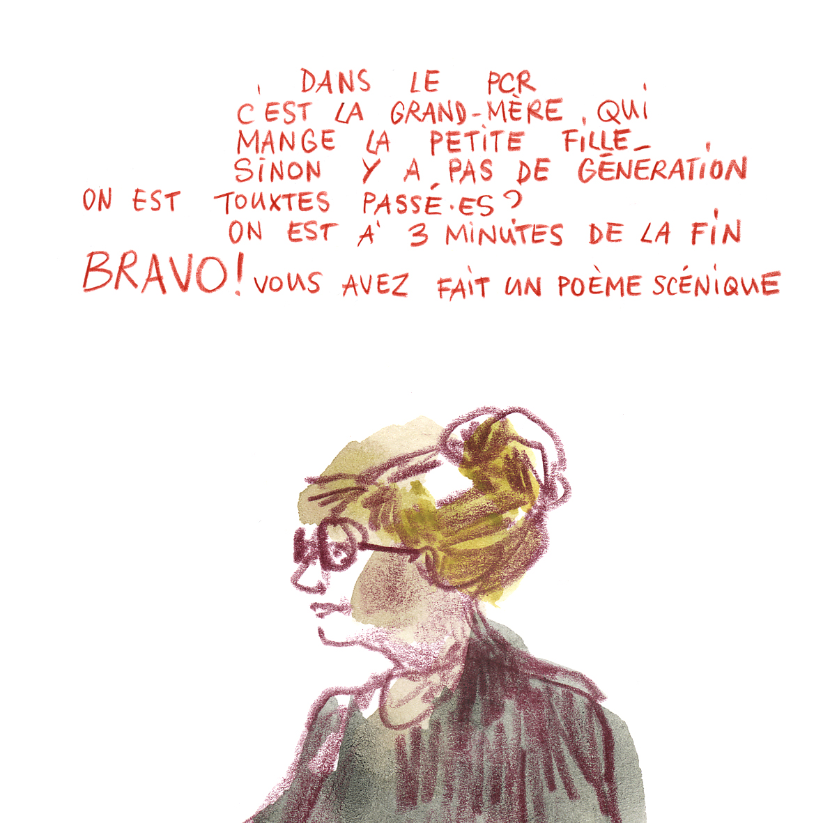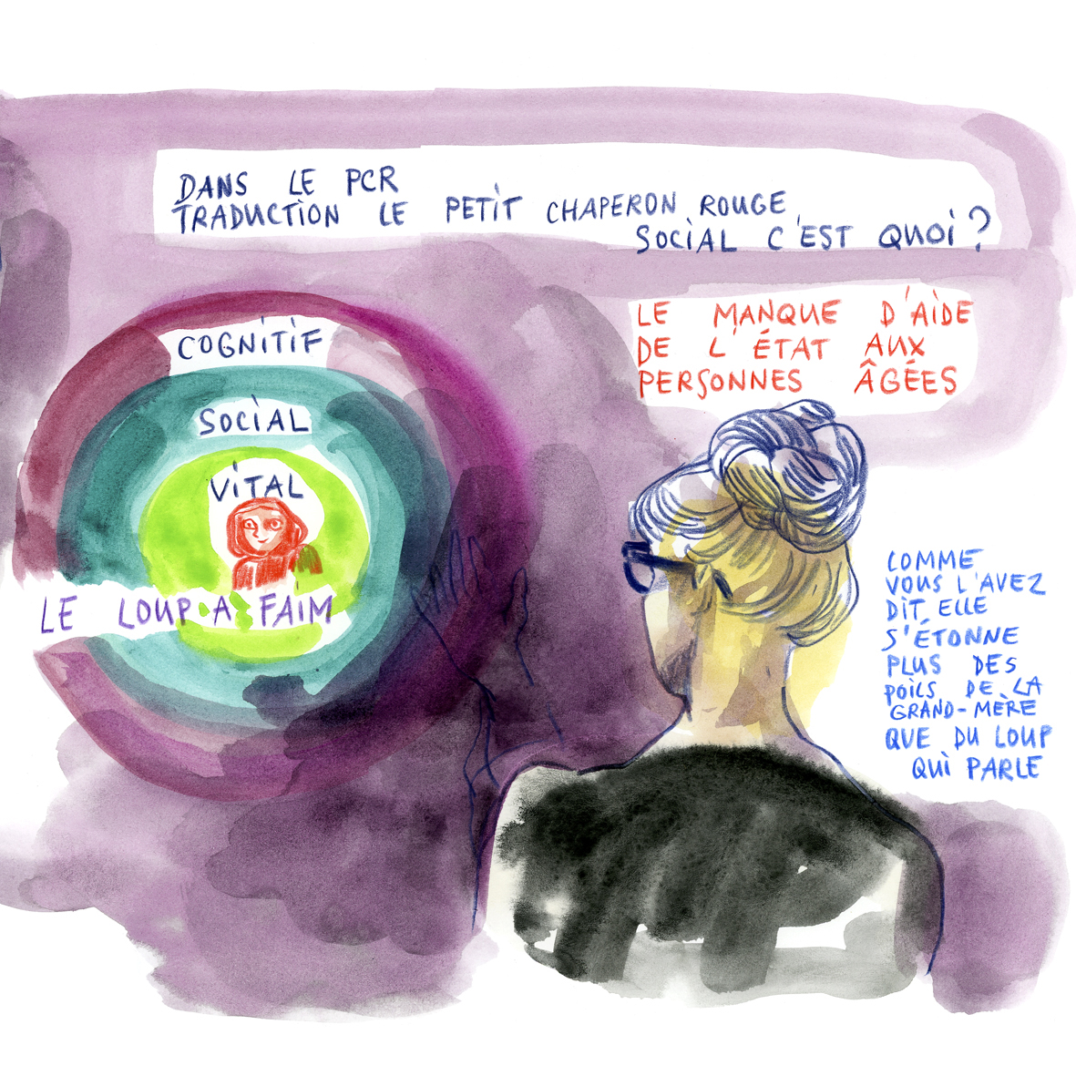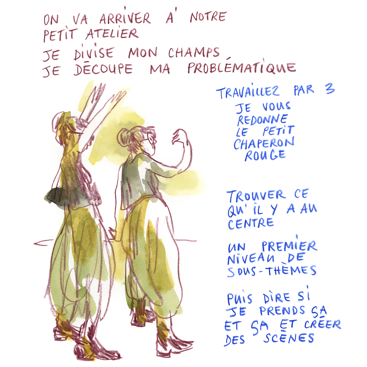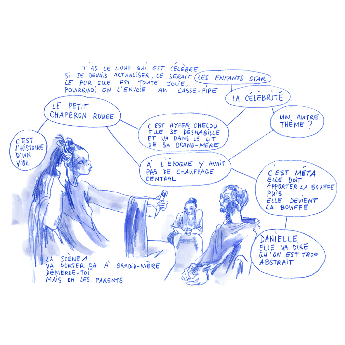 En février dernier, Danielle Chaperon, professeure à l’UNIL et responsable scientifique de la formation, annonce : « Après avoir consacré les deux premiers modules à la « narrativité », nous allons changer d’échelle pour regarder de plus près ce que l’on appelle les « situations dramatiques ». En passant par l’éthologie et la psychologie sociale, nous verrons que ce qui suscite notre émotion, en tant que personne et en tant que spectateur·ice, c’est souvent cela : quelqu’un dans une situation (pas forcément quelqu’un dans une intrigue). Sur cette base, rien n’empêche de faire du théâtre « intéressant » (comme on disait au 17e) sans intrigue, en composant des « poèmes scéniques » ou des « essais scéniques ». C’est ce que nous allons tenter de faire avec le PCR (Le Petit Chaperon rouge), le conte qui nous accompagne depuis le début de la formation. »
