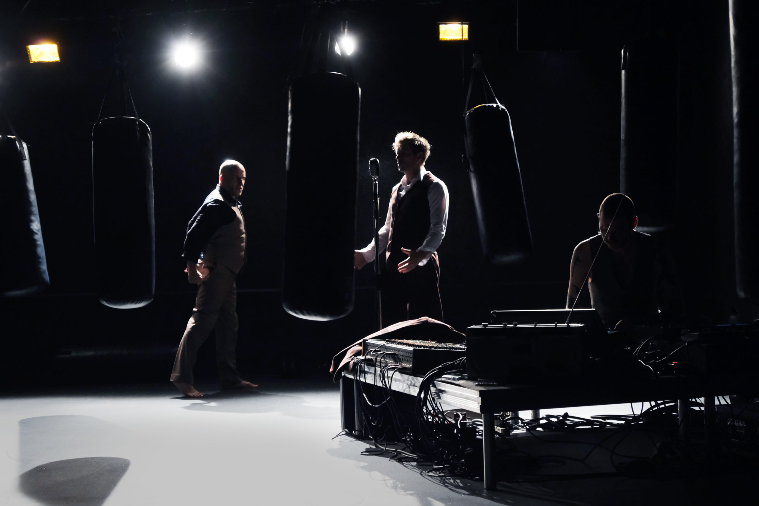 Par souci d’économie, j’ai opté pour une scénographie simple : douze sacs de boxe suspendus. Les lumières créées par Tiago Branquino permettent d’en moduler les volumes. Il a fait un travail magnifique. Lorsque tous les sacs de boxe sont mis en mouvement, naît une sensation de vertige que je n’avais pas imaginée au départ.