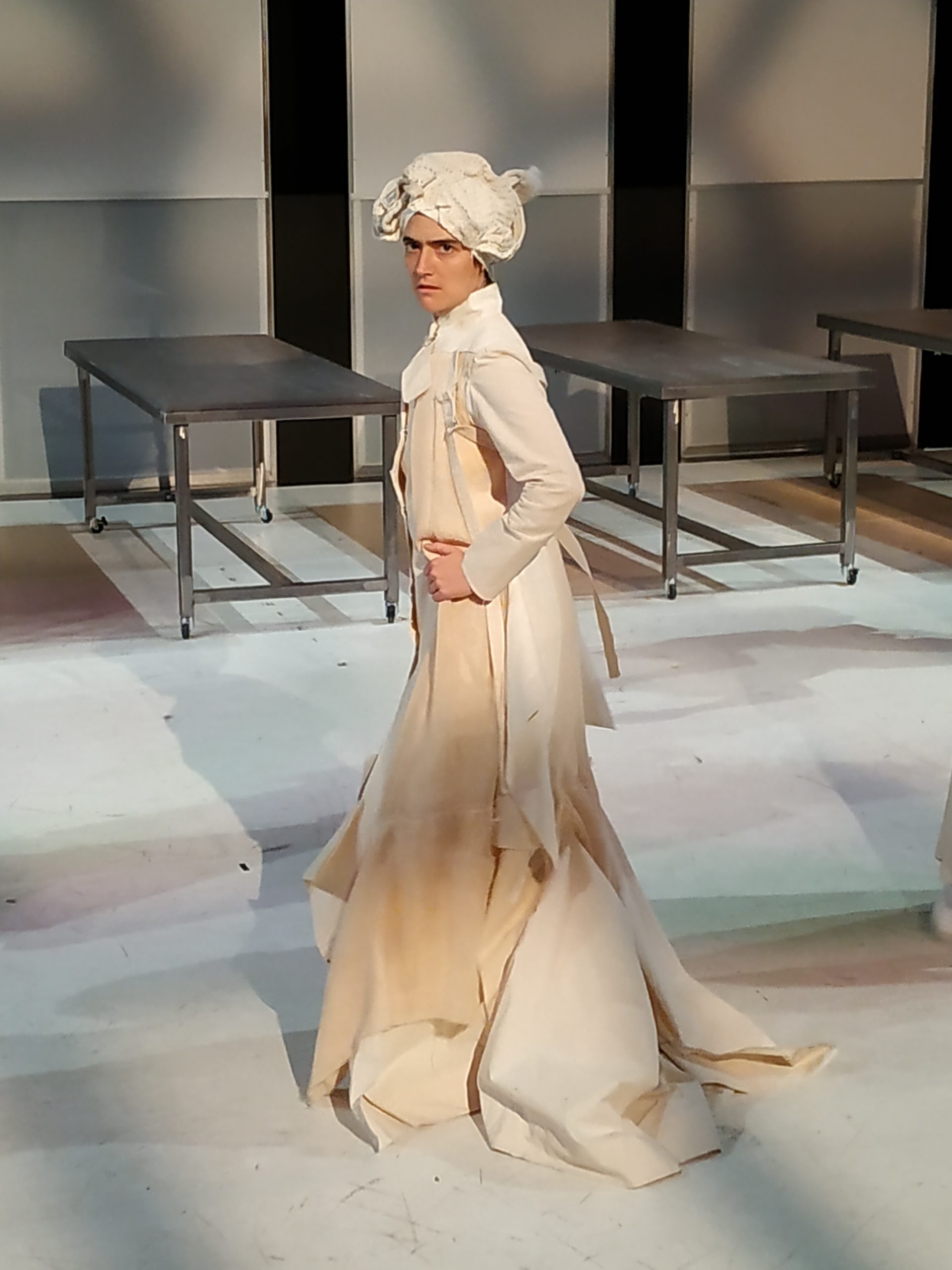 Toni a réalisé les costumes de Une nuit de folie ordinaire, spectacle inspiré des Bacchantes à Gabriel Alvarez. Je portais une panosse en guise de chapeau et un très long manteau blanc cassé, asymétrique, sophistiqué dans sa découpe mais taillé dans un coton brut (voir photo). Il traînait derrière moi, encombrant l’espace ; ce qui a apporté énormément de jeu. Lorsqu’un.e comédien.ne marchait dessus, c’était comme s’il ou elle me marchait dessus. Je réagissais très fort dans le personnage. Ce costume est devenu une partie de moi. La créativité d’un costumier comme Toni nous offre un précieux moteur de jeu.