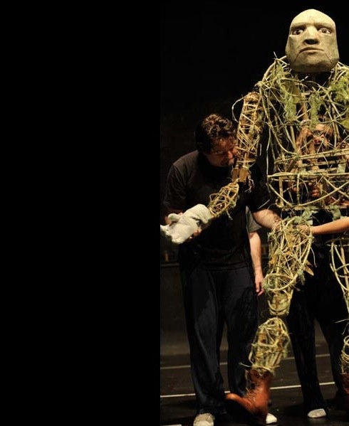 Changement radical de registre et de corps : dans ce spectacle je sortais complètement de ma zone de confort puisqu’il s’agissait de prêter ma voix et ma force à une marionnette de plus de deux mètres de haut. Immense, magnifique, elle ne pouvait bouger que grâce à la coordination précise de trois manipulateurs. J’étais donc épaulé par deux collègues marionnettistes. Je parlais, je chantais, et je manipulais. C’était lourd mais c’était tellement beau quand la « Créature » s’animait, qu’elle déambulait. Quand elle prenait vie, qu’elle marchait, c’était magique. C’était un challenge de la faire bouger, et c’était un vrai travail collectif, j’ai adoré. 1 Un rôle exigeant physiquement, mais surtout révélateur sur le plan théâtral : j’ai compris beaucoup de choses sur cette fameuse distanciation. En faisant de la marionnette, tout s’éclaire : on joue vraiment, on ressent vraiment, on éprouve réellement, mais avec cette conscience du geste, ce recul nécessaire. » Ce spectacle a marqué une sorte de tournant, c’était une expérience nouvelle terriblement enrichissante.